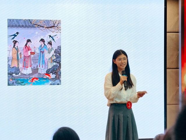 商学院24旅游管理1班的贾亦真同学率先开讲,她演讲的篇目是《诗经》。她以《诗经》中的“根”意象为核心,通过春运返乡的生动场景,巧妙串联起个人情感与文化传承的深刻联结。她以列车上吟诵的“昔我往矣,雨雪霏霏”为引,将古诗意境与现代人离家、归家的情感体验紧密相连,指出《诗经》中的意象是民族情感的深厚之“根”。结合母校二十周年校庆,她号召大家如《诗经》中的草木般勇敢追梦,同时不忘心中“根”的方向,最终以列车到站时的一声“爸妈我回来了”温馨收尾,完美呼应了返乡与归根的主题。