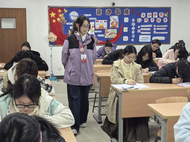 考试过程中,监考人员按照考试流程精准把控发卷、听力播放、答题卡回收等关键时间点,监考时来回轻步巡考,认真监督每位考生的答题情况,全力维护考场安静有序的环境。