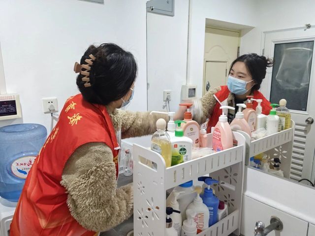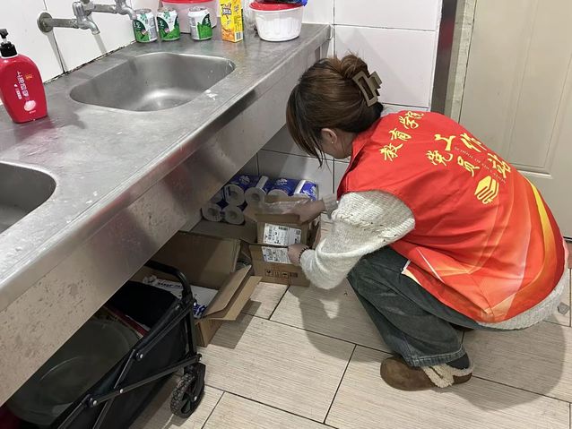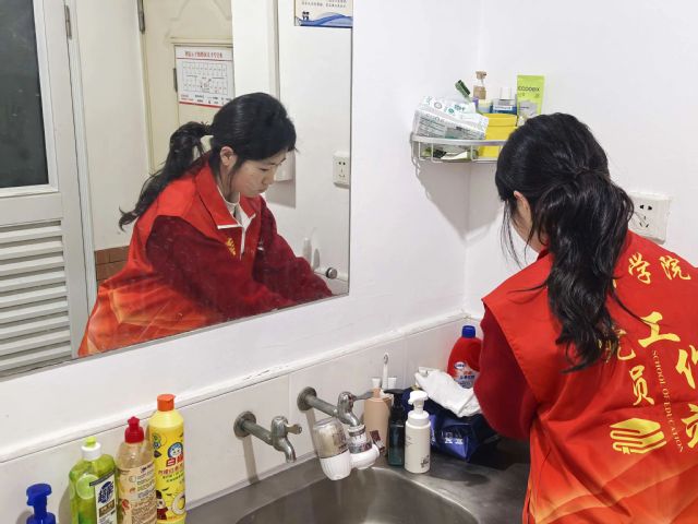 走进 7-103 寝室,我发现寝室氛围十分融洽,但明显存在杂物堆积的情况,我第一时间提醒学妹们及时整理,开展寝室大扫除,共同营造整洁舒适的居住环境。观察中发现,台盆下方随意堆放着不少快递纸盒,我蹲下身子将纸盒逐一整理规整,并细致叮嘱她们明早在规定的垃圾投放时间及时处理;留意到2号床学妹的个人垃圾桶已装满却未更换,我主动动手为其更换了新的垃圾袋。