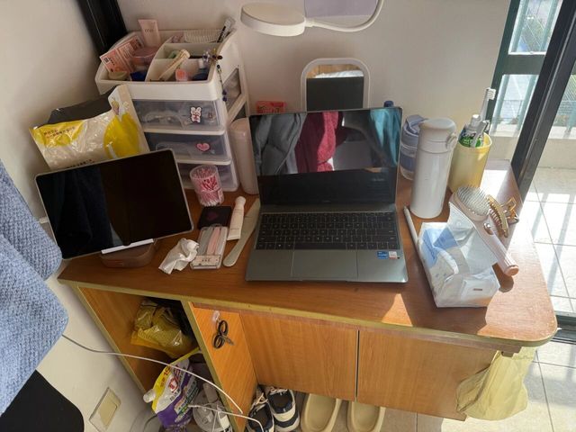 本次结对进入7-641宿舍,首先看到宿舍整体延续了整洁的状态:桌面画材、工具分类收纳得很规整,床铺被褥也都整齐,阳台的清洁工具也归置到位,先肯定了大家日常维护的用心,同时提醒开窗通风时注意别让物品遮挡通风口,让宿舍保持清爽透气。
