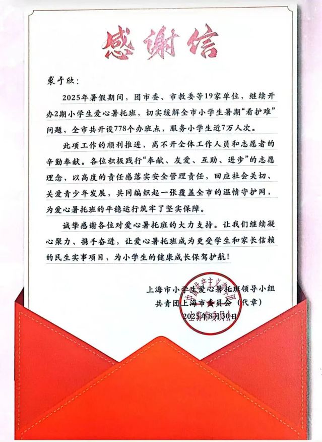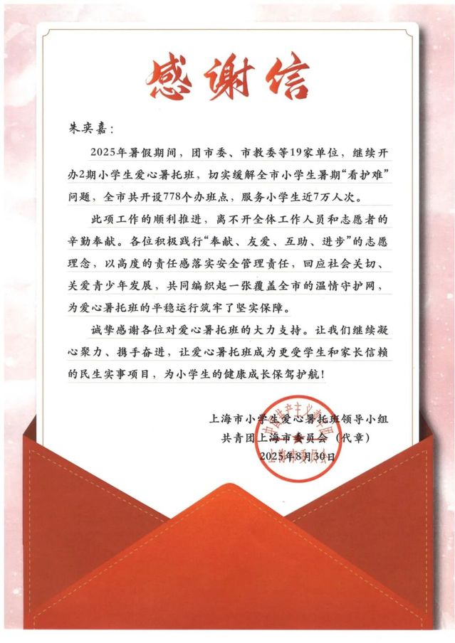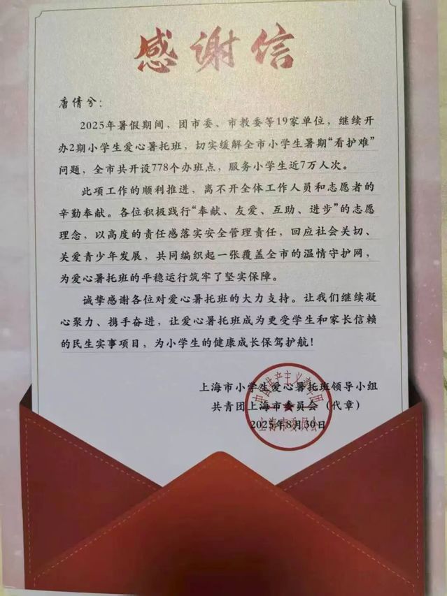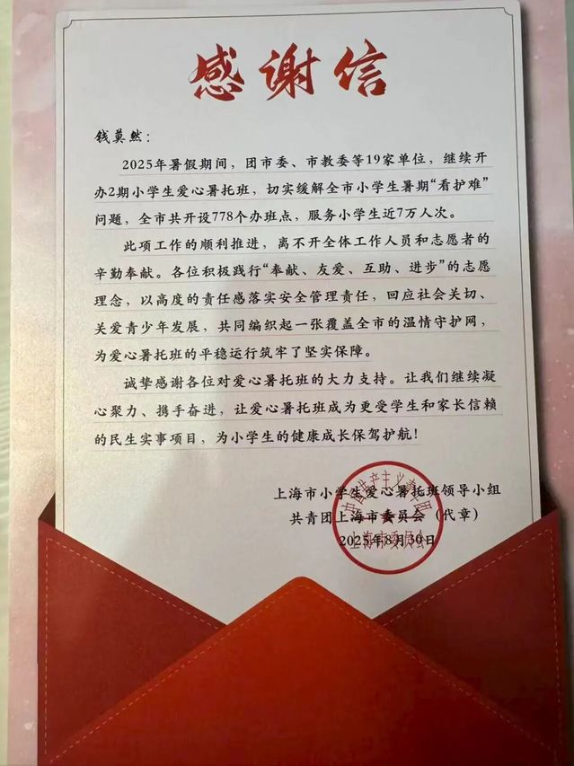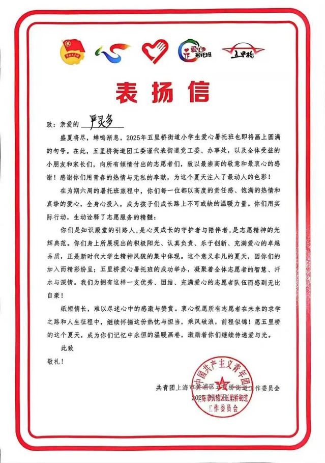 在2025年的暑假,我参与了上海市爱心暑托班项目。我全身心投入,与孩子们共度了一段充实而温暖的时光。这段经历不仅锻炼了我的责任心与应变能力,更让我深刻体会到,用爱心与耐心去呵护每一份童真,是何其有意义的一件事。