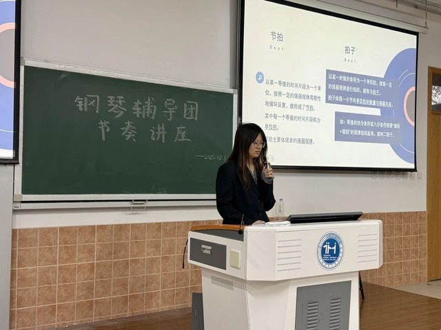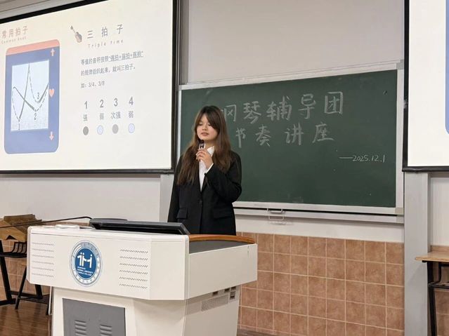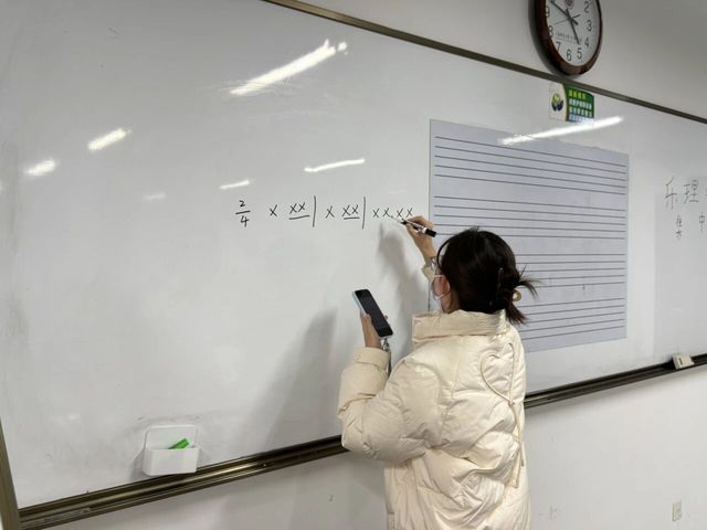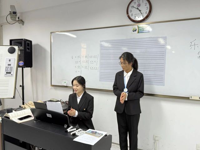 在两位小先生的循序引导与默契配合下,大家以手为器、以桌为鼓,先跟随节拍器进行基础拍打练习,逐步尝试组合不同节奏型。同学们在亲身参与中不仅巩固了理论知识,更真切感受到节奏如何成为连接音乐与情感的桥梁,体会传统乐理与当代生活碰撞出的鲜活魅力。