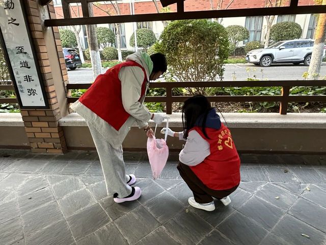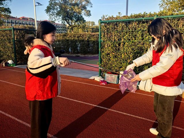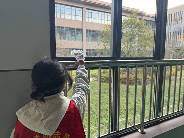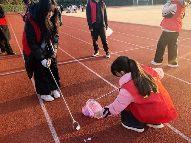动员结束,志愿者们按既定分组分别前往旭华楼、大操场、文化长廊三大区域,正式开启校园清洁志愿服务。旭华楼内,大家认真擦拭窗台栏杆、仔细清扫走廊地面,连墙角缝隙的积尘与散落杂物都逐一清理干净;大操场上,志愿者们弯腰俯身,拾捡草丛中的纸屑、烟头,细致清理跑道周边的落叶与垃圾;文化长廊处,大家手持夹子捡拾散落纸屑与各类杂物,认真清理角落堆积的落叶,全力还原长廊干净整洁的环境。