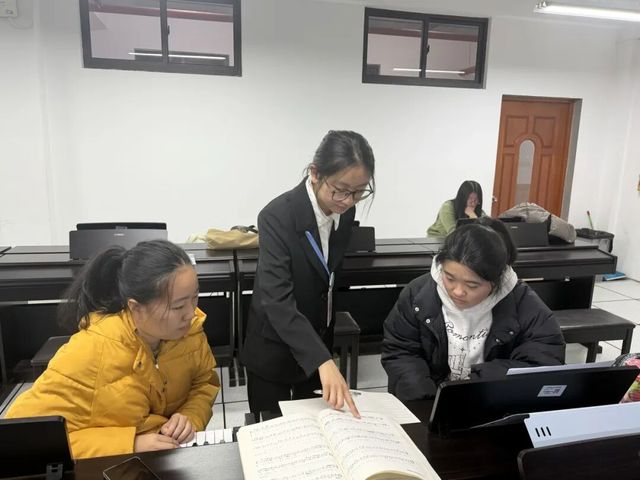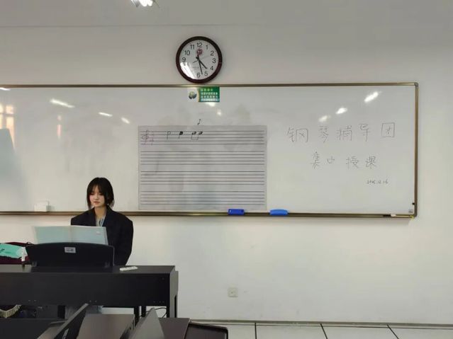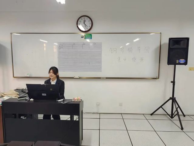 沈奕臣小先生以歌曲《左手右手》开展视唱练习。她先带同学们逐行识谱,理清音符节拍,再逐句示范领唱,耐心纠正音准节奏问题,最终实现同学们独立视唱。