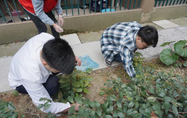 接着,大家于各栋宿舍楼附近进行捡烟头活动。同学们一手戴着手套,一手拿着垃圾袋,沿着一楼外围的绿化带仔细捡拾丢弃在道路及绿化带中的烟头,不放过任何一个角落。经过半个多小时的工作,部员们将沿途道路及绿化带清理得干干净净,收获满满几袋烟头,使校园环境焕然一新。