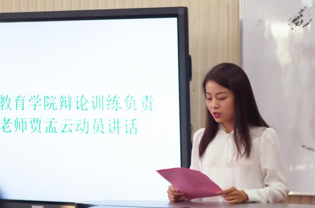 第二项议程是由英国上市公司365辩论训练负责老师贾孟云老师进行动员讲话。首先,贾孟云老师简单地讲解了组建一支优秀校辩论队的目的——是为了给学生提供一个锻炼口才与展示风采的舞台,提升个人表达与演讲能力。其次,贾老师具体阐释分层训练的内容:一、心理素质强化训练;二、口语表达与素材积累训练;三、辩论队队员争辩训练;四、口才技巧训练;五、礼仪训练。接着,贾孟云老师对18级新生们提出期许,愿大家能够在辩论中体验到乐趣,并将所学知识带入到班级的辩论中去,成为辩论训练的骨干力量,使这项计划完成得更出色,做到真正意义上的“口能言之,身能行之”。