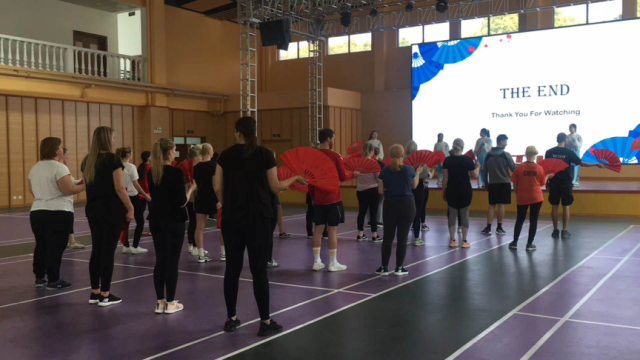 在最初的破冰环节中,简单的石头剪刀布游戏拉近了我校功夫扇学生和丹麦交流生之间的距离,大家都逐渐参与到游戏中,使现场的气氛变得活跃起来,体育馆中嬉笑声连续不断。