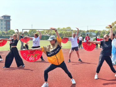 功夫扇交流环节分成三个部分进行:热身活动、小组学习、集体演示。他们手持红色牡丹功夫扇,表现出极强的好奇心,纷纷跃跃欲试,开扇合扇,在小组教学中,学习积极性和主动性很高,在春天和煦的阳光下,场地上不断响起丹麦学生“哈”的呐喊声。尽管他们的动作略显生疏,但五名教育专业的“老师”们用标准、到位的功夫扇动作,娴熟、耐心的英语讲解让交流生们在轻松活跃的氛围里学会了精心编排的十六式功夫扇动作,切身体会到功夫扇这项运动的魅力。