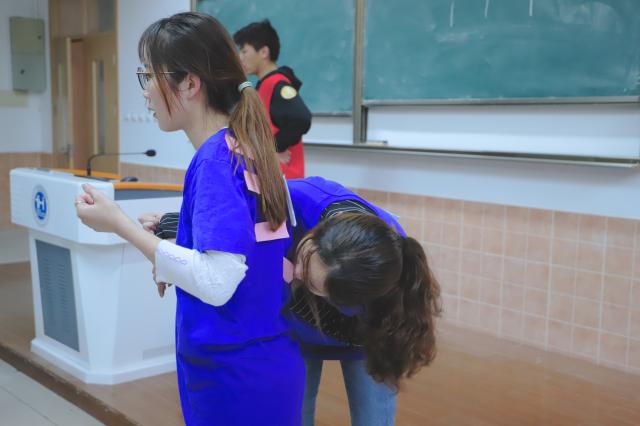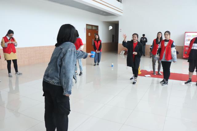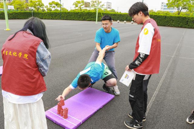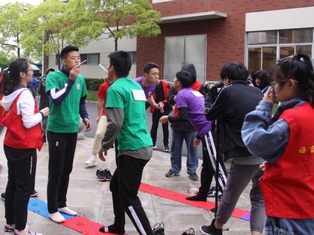 第二个项目是“叠叠乐”在篮球场举行。选手们要在手均不沾地的情况下靠队员的帮助,将1.3米外的纸杯叠起来。选手们纷纷试探着去够杯子,这非常考验选手们的力量和配合,稍有不注意便要摔到垫子上了。由我们学院两位副辅导员组成的队伍轻轻松松的就完成了标准动作,一旁的同学甚是羡慕。