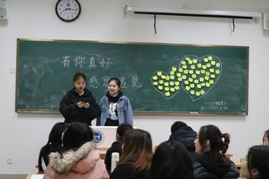 本次班会主题为感谢有你,学期马上就要结束了,在刚来到大学的第一学期,你有得到过哪些人的帮助呢?辅导员、班助理、学长学姐亦或是同班同学?为了加强班级体对感恩意识的认知,提高每个同学对生活和生命的热爱,总结分享这一学期的收获与成长,激励同学们好好复习准备期末考试。通过这次的班会,交流彼此之间从刚开始到如今对互相的看法的变化,更增加同学们之间的友谊,使这个团体变得更团结。