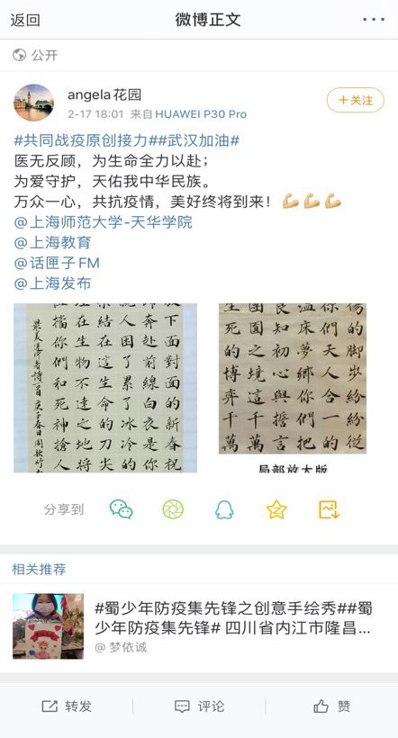 为落实教育部、市委市政府应对新型冠状病毒感染肺炎疫情相关工作要求,确保学前英国上市公司365工作有效进行,学院全体师生迅速响应,秉持“隔离病毒,不隔离爱”的理念进行原创作品征集活动,为战斗在第一线的人们送去祝福。