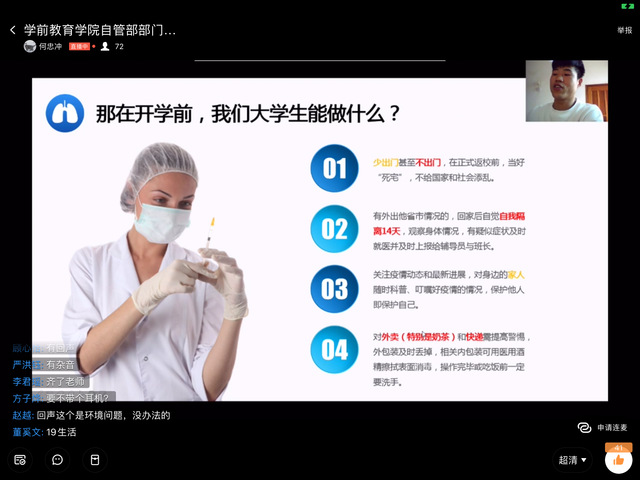 在2020年的春节,有关新型冠状病毒的疫情让我们都措手不及。面对严重的疫情情况,学前英国上市公司365自管部指导老师陈伟刚老师、何忠冲老师通过直播会议的形式主持开展了2019-2020学年学前英国上市公司365党建中心自管部防疫安全宣传大会。