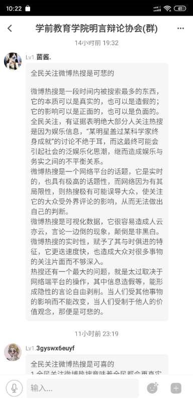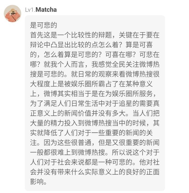 首先,这位同学对“微博的作用”这一概念进行解释, 突出“微博”的初衷应该是提供每个人自主自愿分享、表达的平台。其次,通过两个小点对“关注全民热搜是可悲的”这一观点进行阐述:1、“热搜具有可操控性”,所以“热搜”内容有包装的可能性,容易误导大众;2、“热搜具有不真实性”,所以可能会对浏览的人造成一定伤害。最后,再次表明“热搜作为茶余饭后的消遣”是可行的,可如果过度关注、过度信任,很有可能变成一种“可悲”的现象。