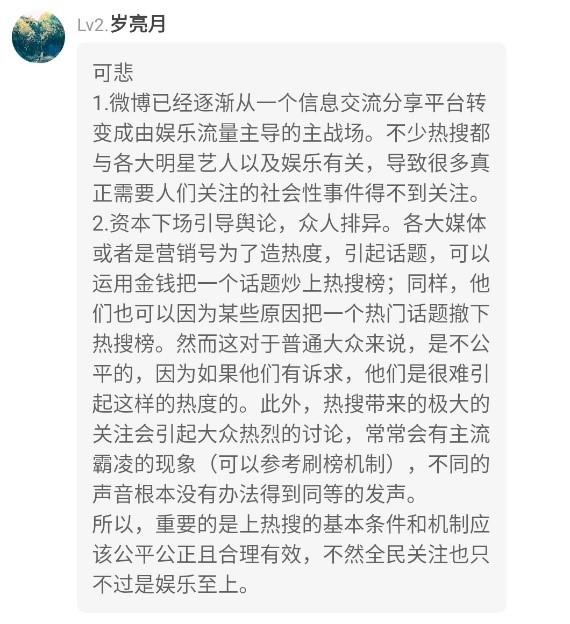 一个普通网民想要凭一己之力改变热搜难于登天,有些热门话题根本就是金钱消费的结果,而不是全民想要关注的话题。这对于普通大众来说是不公平的,因为如果他们有诉求,很难引起这样的热度。