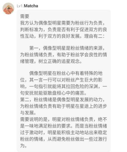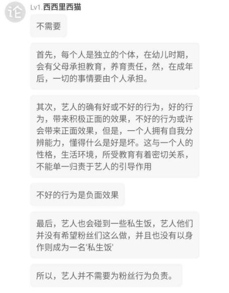 每个人的言行举止都是由自身素质决定的,明星作为公众人物,大多数都是十分注意自己言行的。明星偶像有引导粉丝的义务,但粉丝有成千上万,不要加给他们那么大的责任。明星偶像作为公众人物,你们可以批评议论、指指点点,甚至是谩骂、侮辱,这是你们的权利,也是成名的代价。但单单粉丝行为要偶像买单这点,非常不认同。