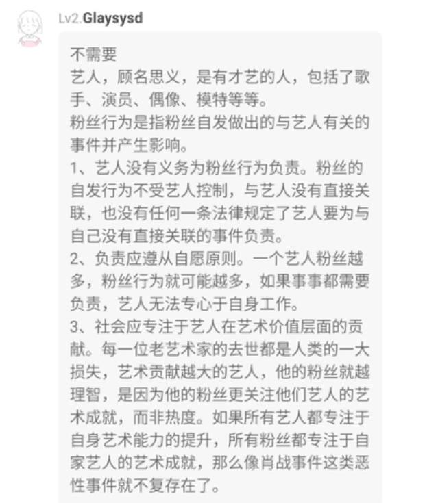 其次,她认为负责应遵从自愿原则,粉丝的行为不必都由艺人来承担。社会也应该多加关注艺人在艺术价值层面的贡献,以此来杜绝恶性事件的发生。