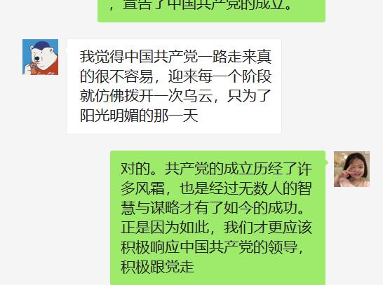 积极分子张梦莹也提出对自己而言,这是一次难能可贵的机会,让我在学习“四史”之后将自己学习到的知识传递给其他同学。这是一次挑战,但也为我今后的教师职业提供了帮助。我也从中学习到如何用对方喜欢的方式将对方需要获取的知识传授给对方。互相交流中,我也从对方的认知角度、思维层面与我的经验进行了对比,两个人的想法进行融合,得到的效果是比一个人更加完善、全面的。对结对同学而言,这一次的学习机会是很宝贵的,更早的接触到“四史”内容的学习,提高了自身的思想觉悟。更加主动的了解时事政治,了解党的有关知识,更加积极努力的向党组织靠拢。