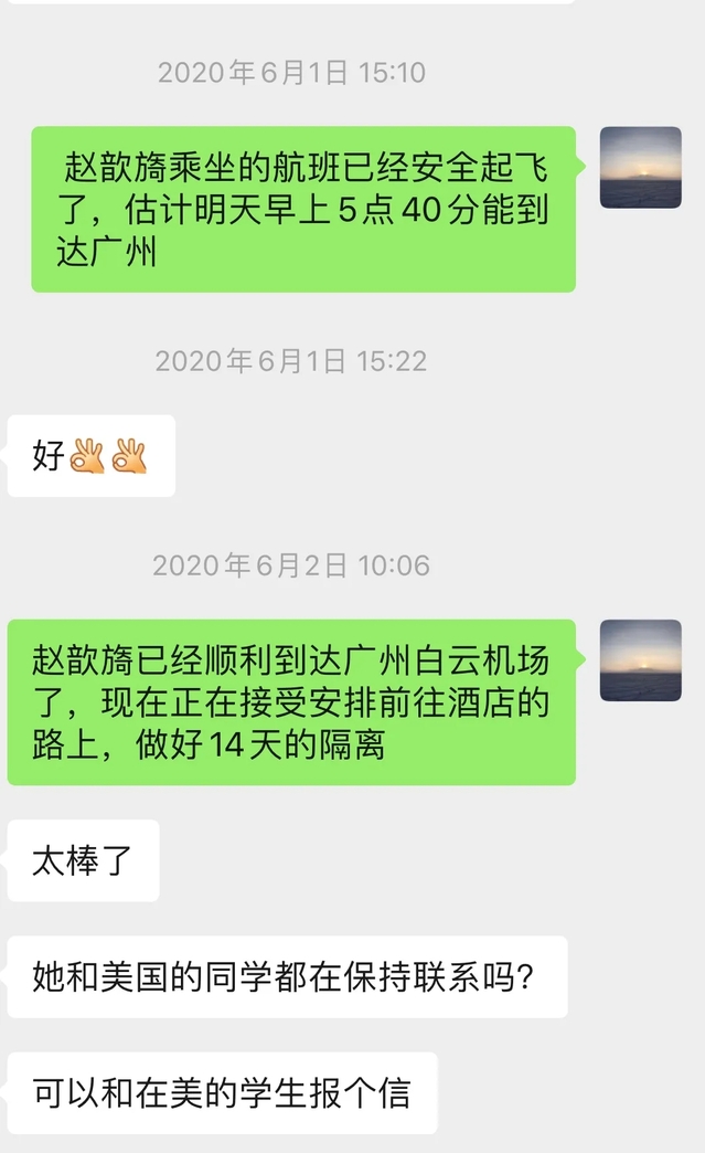 我院领导老师高度关注学生机票的购买情况,在我院领导的关心指导下,杨荻老师及时汇报学生的身体健康情况。除此之外,杨荻老师制定了详细而周全的归国准备工作,坚持三个工作措施、两个关注和一个协助。