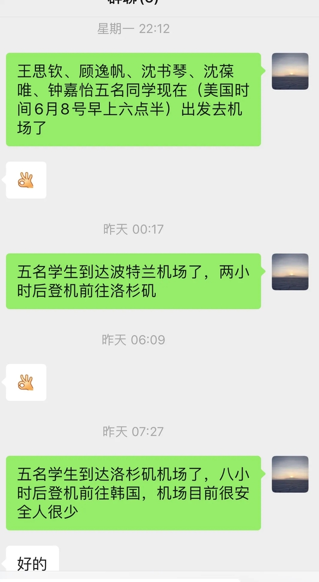 目前14名同学目前已经购买了回国机票。由于疫情期间航空管制的原因致使机票购买困难、同学们的回国日期跨度大,将分批次陆续归国。最早订购机票的同学已于6月2日凌晨05:40分抵达广州白云机场,目前在按照要求在酒店进行14天的隔离。还有五名同学于将于国内时间6月8日从波特兰机场出发,转机洛杉矶、韩国、日本预计于6月11日到达上海浦东机场。