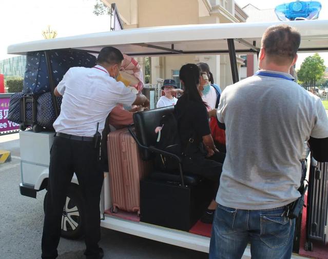 由于防疫要求,家长及私家车无法进入校园,为此学校为同学们安排了短驳车,减轻搬运行李的难度。