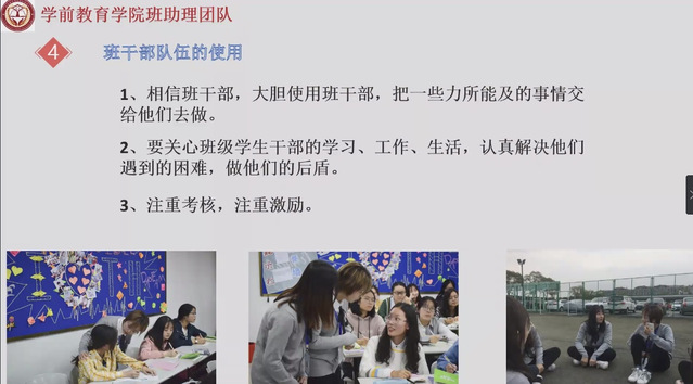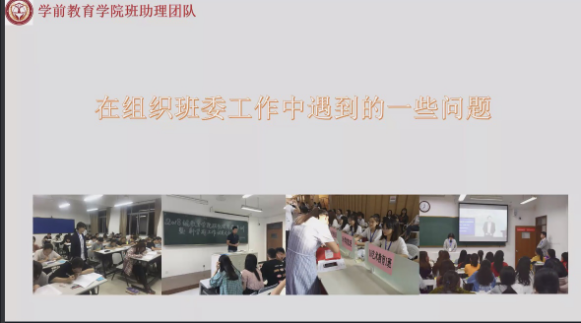 其次,邱晟吉老师提出理论教育培训如班干部培训、班干部会议等可以快速提高班委的各项能力,快速适应且胜任工作。阶段性的实际工作讲评又能够使班委不断认识到自己的不足并及时改正。所以,在班委的培养过程中我们需要将二者相结合。紧接着,邱晟吉老师向我们展示了自己担任班助理时参与班委活动的照片,以自身经验充分体现了班委的培养需要通过社会实践、校园文艺活动和公益活动的展开,以锻炼学生干部的工作和处事能力。
