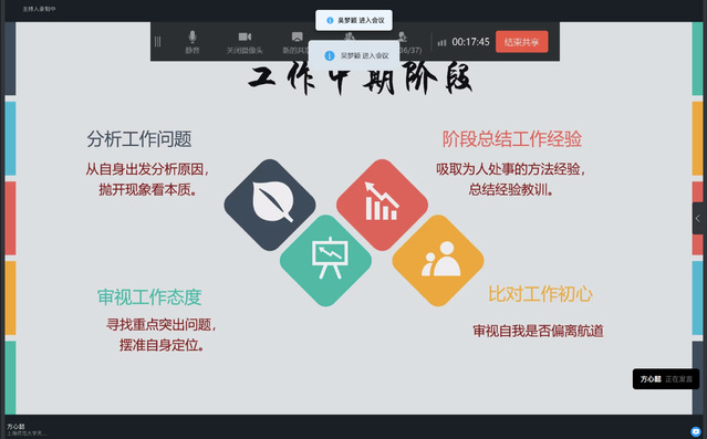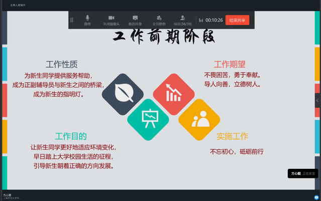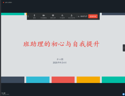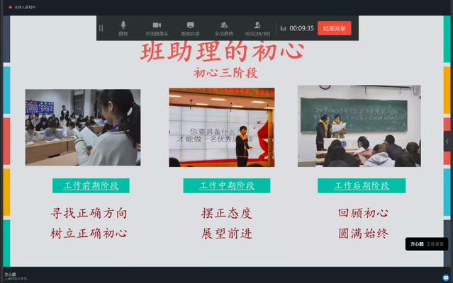 紧接着,方心懿同学从细节方面入手,为各位2020级实习班助理们讲述了如何在工作的不同阶段中“坚守初心”。