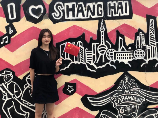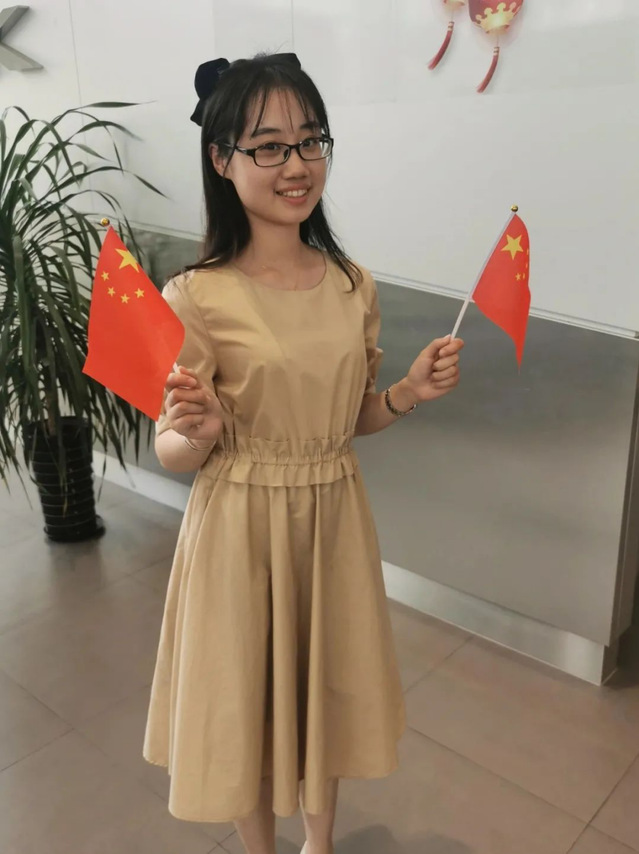 (图片4:新生张芷芸与国旗合影)