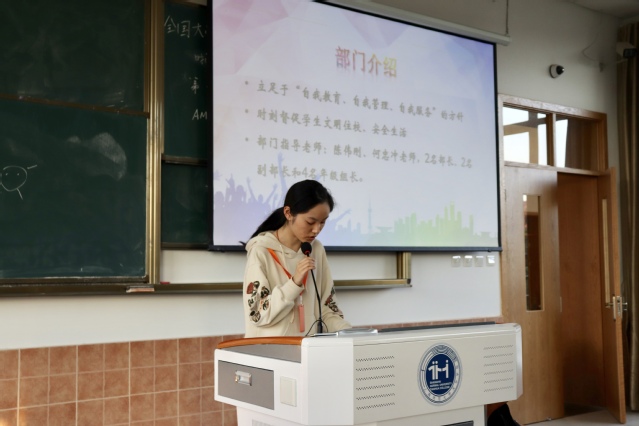 19级安全员代表王梦瑶同学强调了自管部的重要性,表示经过这个漫长的假期之后,大家对于工作可能会有些生疏,希望大家尽自己的本职工作,努力加油,并对新生表示欢迎,激励新生去进行自我挑战。
