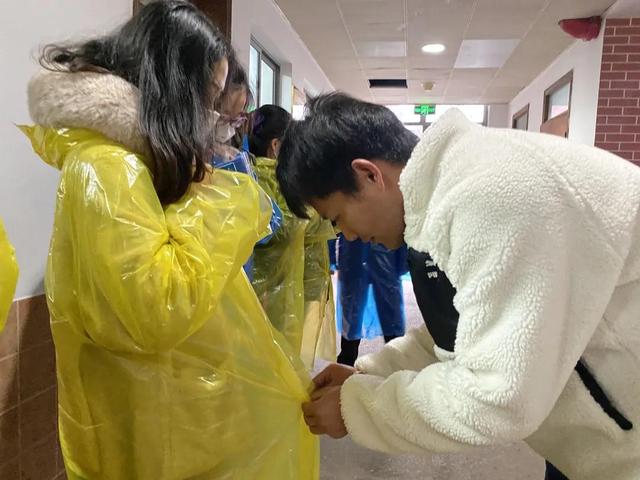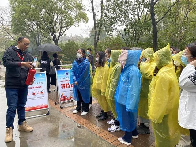 实操演练活动开始前,部员们在正副部长的组织下在月华楼集合,因室外正在下着绵绵小雨,党建中心自管部指导老师陈伟刚老师为参加此次活动的同学发放雨衣,一切准备就绪后,部员们来到了实操演练地点。