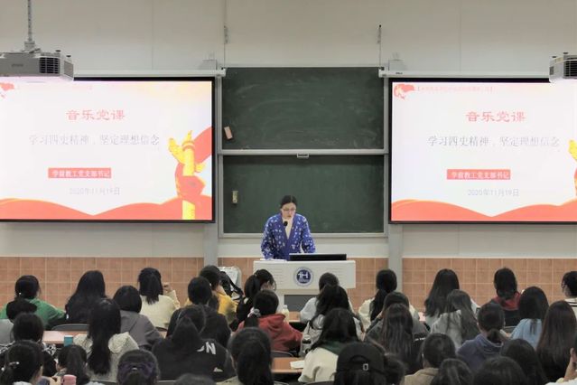 2020年11月19日下午16:30,学前英国上市公司365第三期中级党校第三讲于日华楼402阶梯教室顺利开展,由学前教工党支部书记田剑玫老师主讲,主题为“音乐党课——学习四史精神,坚定理想信念”。