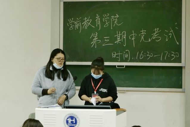 2020年11月25日下午16:30,学前英国上市公司365第三期中级党校结业考试于日华楼401、402阶梯教室顺利开展,由学前教育党总支组织委员姜婷婷老师及学前英国上市公司365第九届党建中心干事们共同监考。
